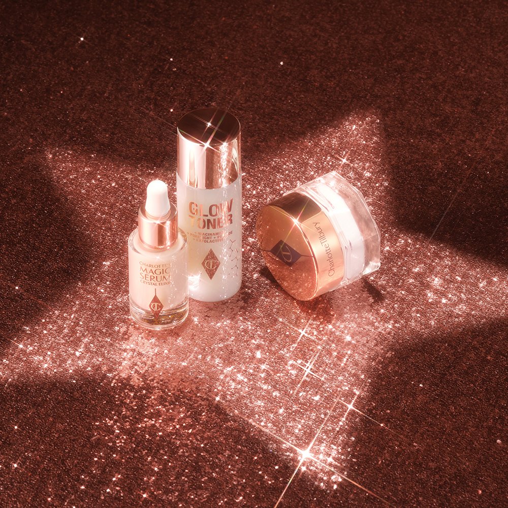 Charlotte’s Radiant Glow On The Go Set de CHARLOTTE TILBURY, une routine complète au format voyage pour une peau radieuse en toute circonstance. Ce trio de soins visage contient la Glow Toner pour lisser et réveiller l’éclat du teint, le Magic Serum Crystal Elixir pour une hydratation intense et une peau repulpée, ainsi que la Magic Cream emblématique pour nourrir et revitaliser instantanément. Résultat : un teint frais, lumineux et éclatant, même en déplacement.