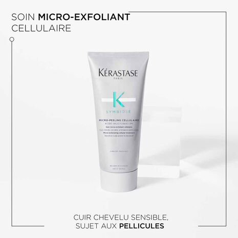 Micro-Peeling Cellulaire Symbiose de Kérastase est un soin exfoliant conçu pour les cuirs chevelus sensibles sujets aux pellicules. Sa texture gel transparente enrichie en graines d’argan et d’abricot aide à éliminer les cellules mortes tout en respectant l’équilibre du cuir chevelu. Grâce à l’acide salicylique, il agit pour purifier, réduire visiblement les pellicules et rafraîchir la racine des cheveux. Le cuir chevelu est apaisé, plus sain et prêt à recevoir les soins suivants de la routine. Son parfum aux notes d’agrumes et de jasmin transforme l’utilisation en véritable moment de bien-être sous la douche.