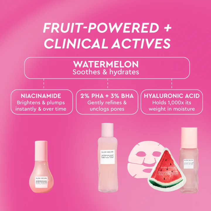 Watermelon Glow Dewy Skin Routine de GLOW RECIPE réunit les essentiels pour révéler une peau lumineuse, fraîche et intensément hydratée. Enrichie en pastèque juteuse, en niacinamide éclatant et en acide hyaluronique, cette routine agit pour lisser, unifier et booster l’éclat naturel de la peau. Chaque soin travaille en synergie pour hydrater, tonifier et illuminer le teint. La peau paraît plus rebondie et visiblement éclatante jour après jour. Idéal pour adopter une routine glow complète, simple et efficace.